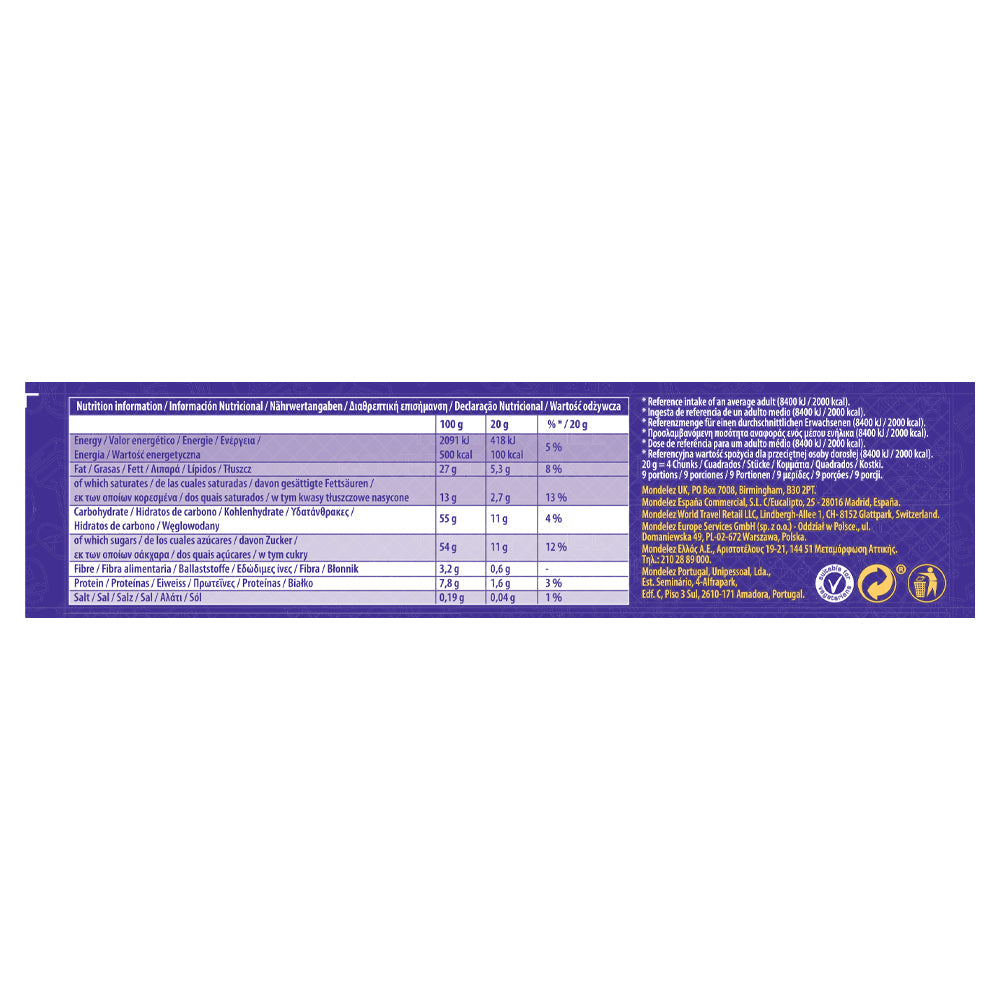 Cadbury Dairy Milk Fruit & Nut contains Dairy Milk milk chocolate with sultanas and almonds.