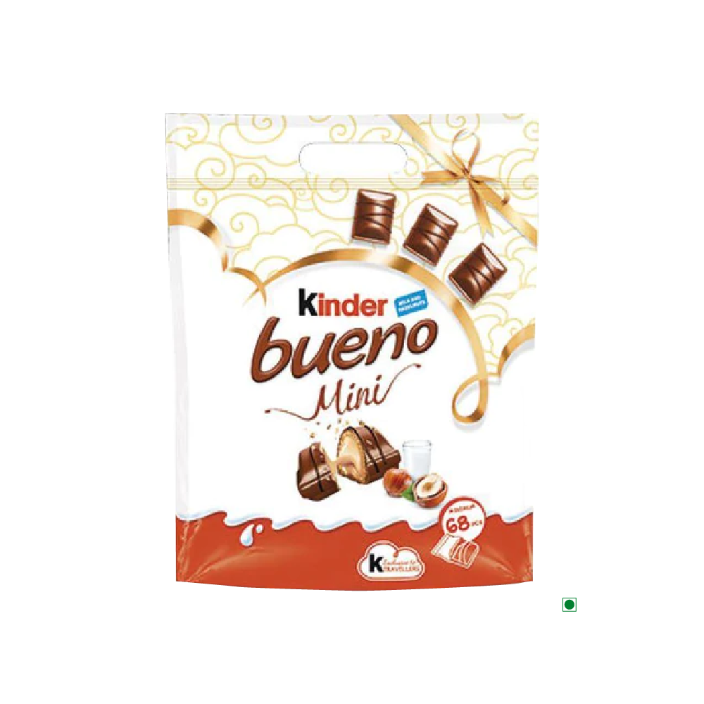 Kinder Bueno Mini, the same delicious layer of crispy wafer, milk chocolate and hazelnut milky filling of Kinder Bueno now comes in single and individually wrapped bites ideal for sharing.