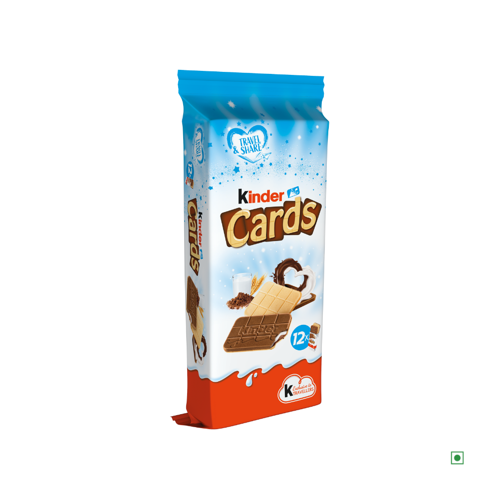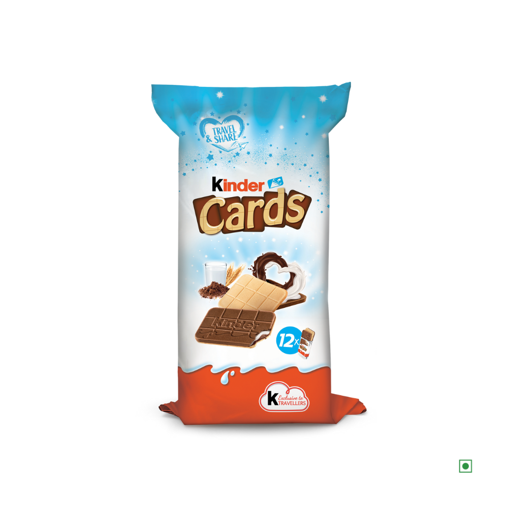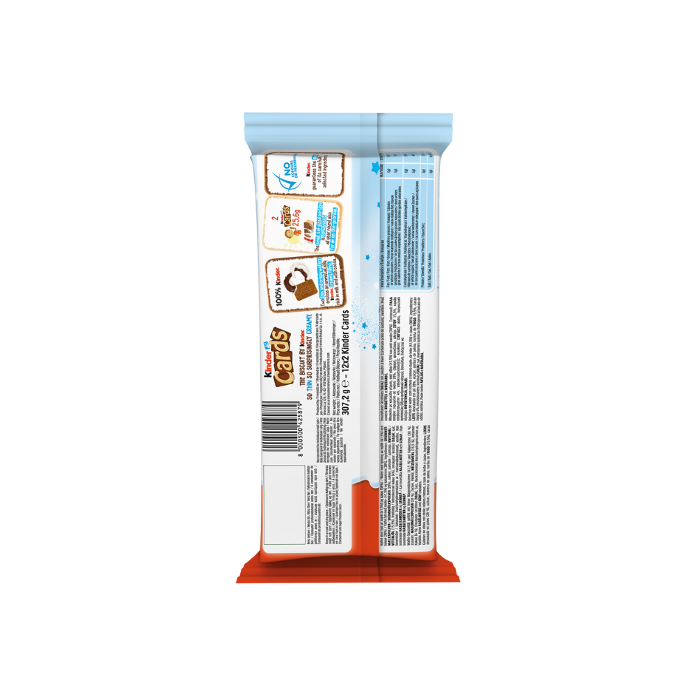 Kinder Cards consists of two simple and crispy card-shaped wafers that enclose the unique Kinder filling without melting or crumbling. A portable pack containing 12 flow packs, each of them with 2 biscuits inside, perfect for sharing.