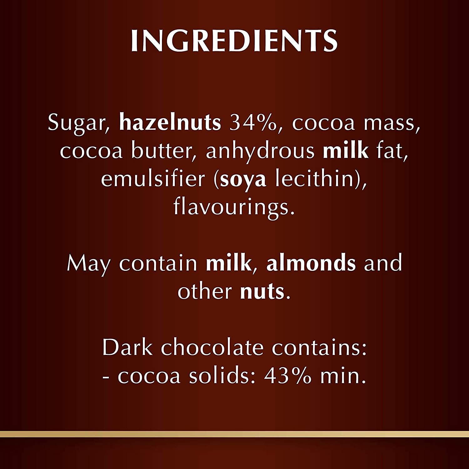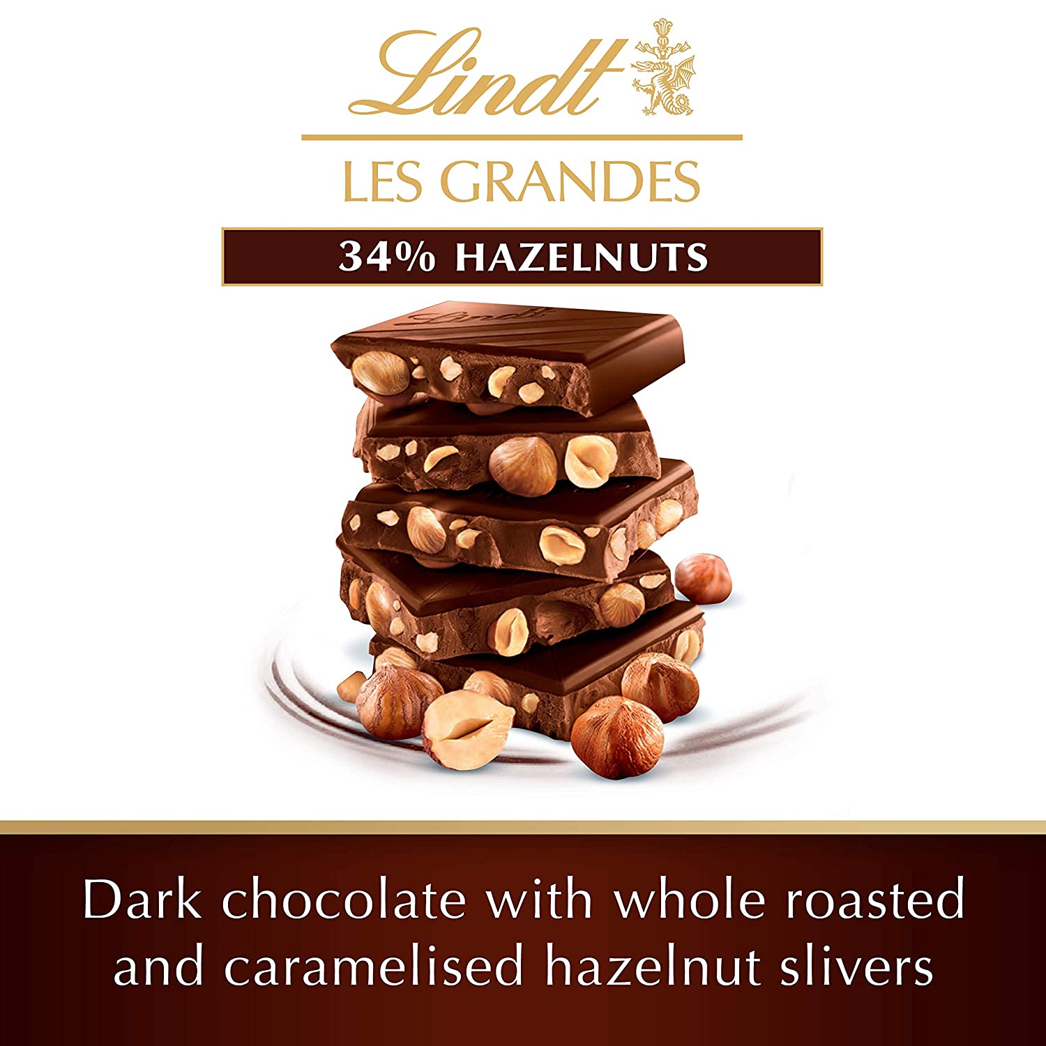 Swiss dark chocolate and 34% hazelnuts combine to make this exquisite Lindt Les Grandes hazelnut dark chocolate bar. The perfect blend of roasted hazelnuts and caramelised hazelnut pieces along with sustainably sourced cocoa beans creates a wonderfully crunchy, indulgent treat that can be enjoyed in a moment of indulgence alone or shared with friends. The Lindt Master Chocolatiers have been perfecting the art of chocolate since 1845 to make sure you receive the very finest experience.