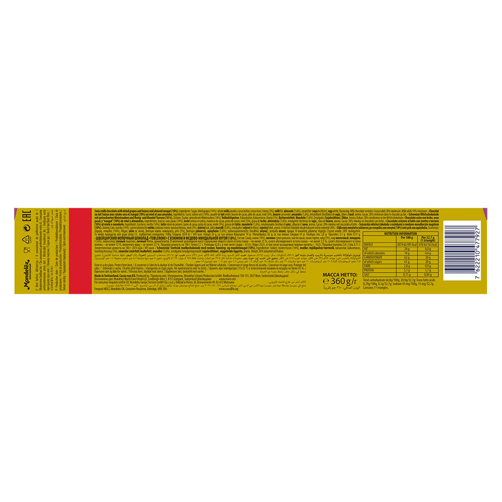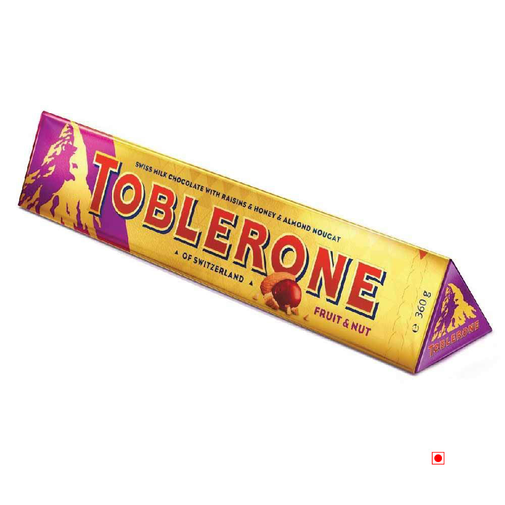 Enjoy Toblerone, the iconic triangular chocolate from Switzerland, with a twist. The beloved Toblerone milk chocolate is now enriched with fruit and nut. This 360g Toblerone Fruit and Nut Bar makes for the perfect purchase for home or even as a gift to a loved one.