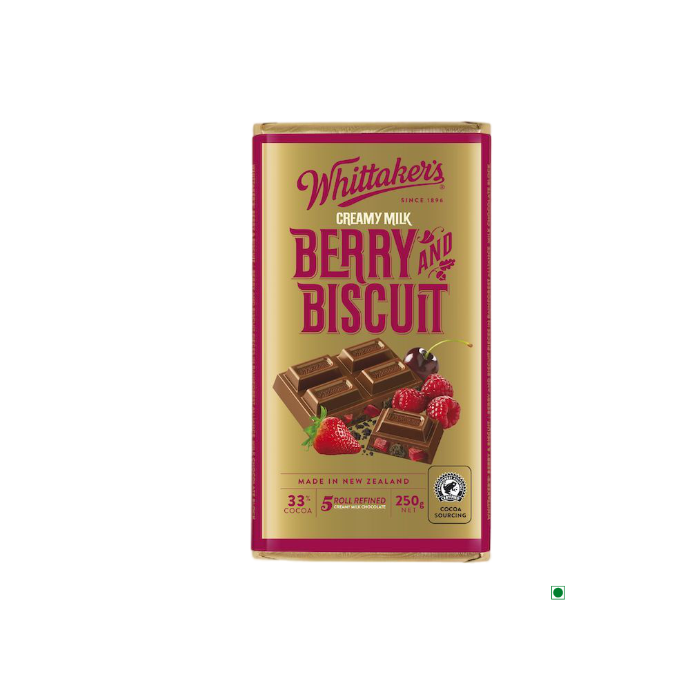 Berry & Biscuit 33% COCOA 5 ROLL REFINED. Our super smooth 33% cocoa, 5 Roll Refined Creamy Milk chocolate, filled with tangy berry pieces and crunchy black cocoa biscuit.