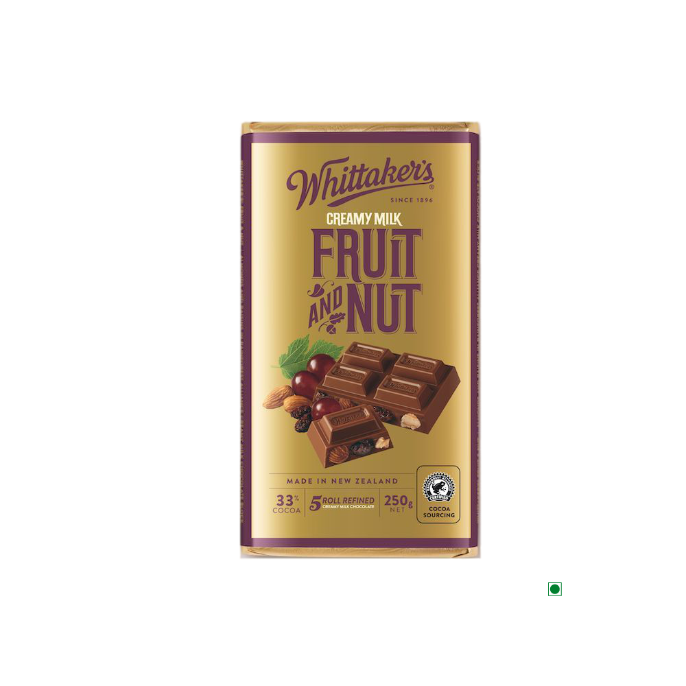 Fruit & Nut 33% COCOA 5 ROLL REFINED. Californian raisins combine with freshly roasted almonds in our wonderfully smooth 33% cocoa 5 Roll Refined Creamy Milk chocolate.